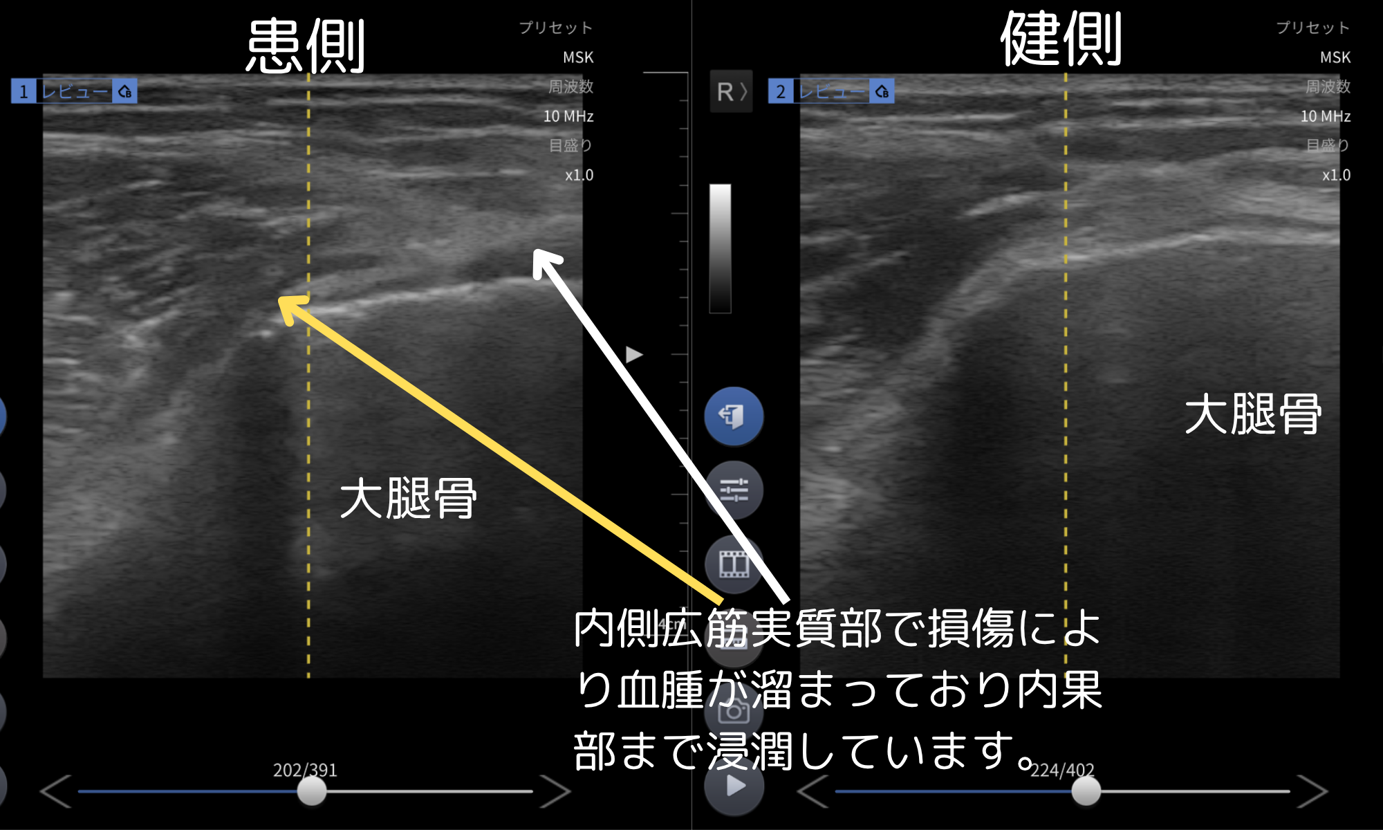 右膝の内側に圧痛と運動時痛が確認され、エコー画像から内側広筋の筋損傷(肉離れ)と判明。