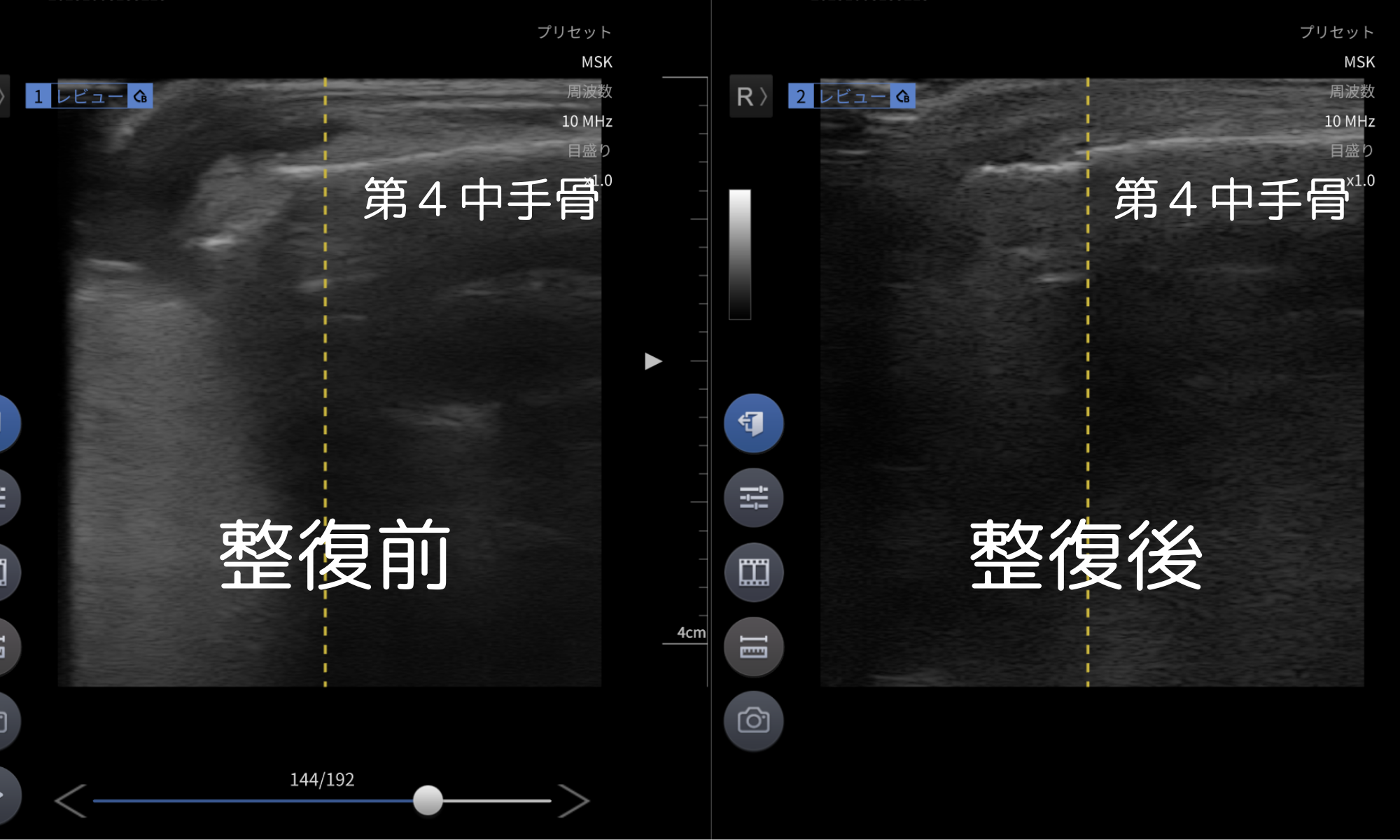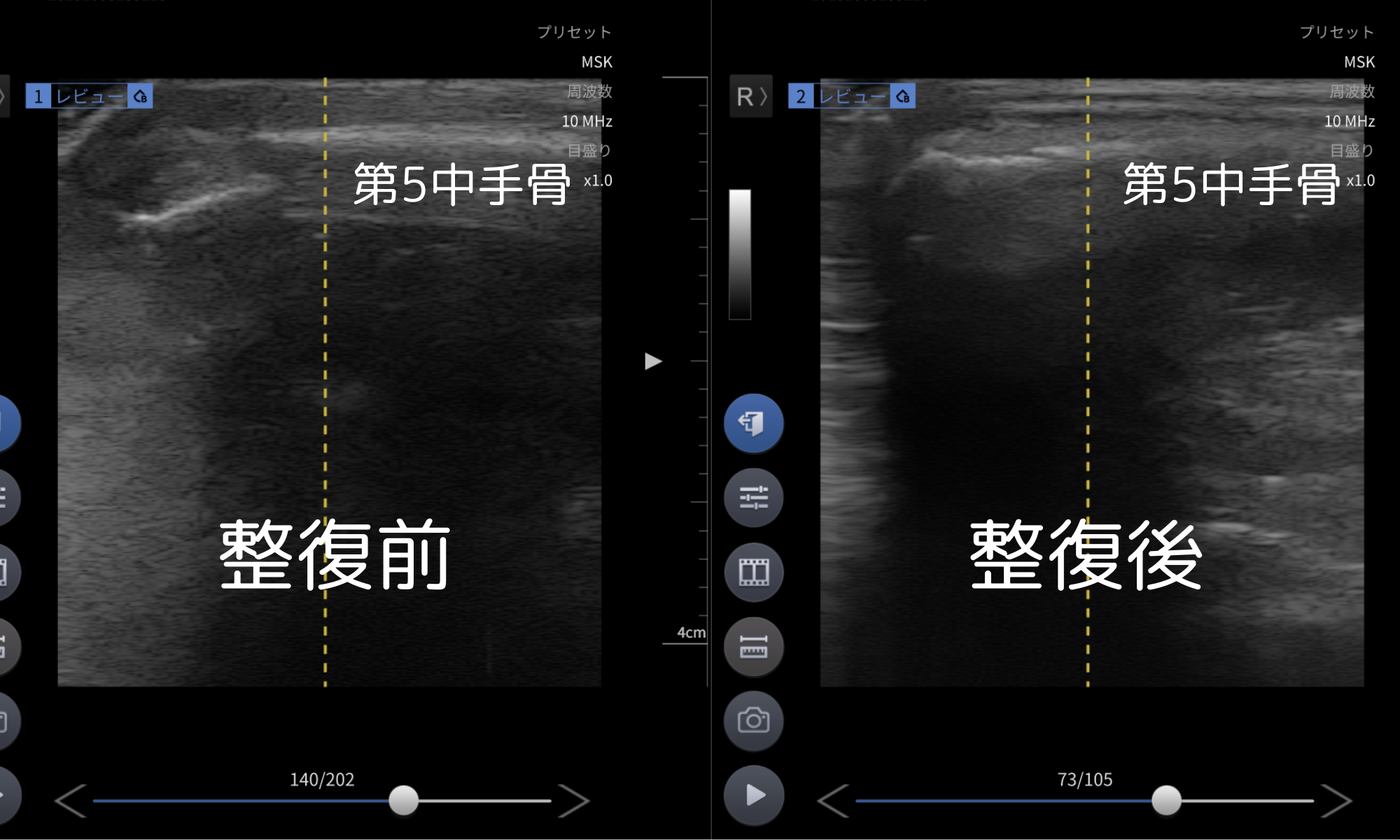 整復の前後でエコー観察を行い、骨皮質の段差やアライメントの変化を確認しました。 画像で変化を確認できることは、固定肢位の妥当性や再転位リスクの説明にも役立ちます。