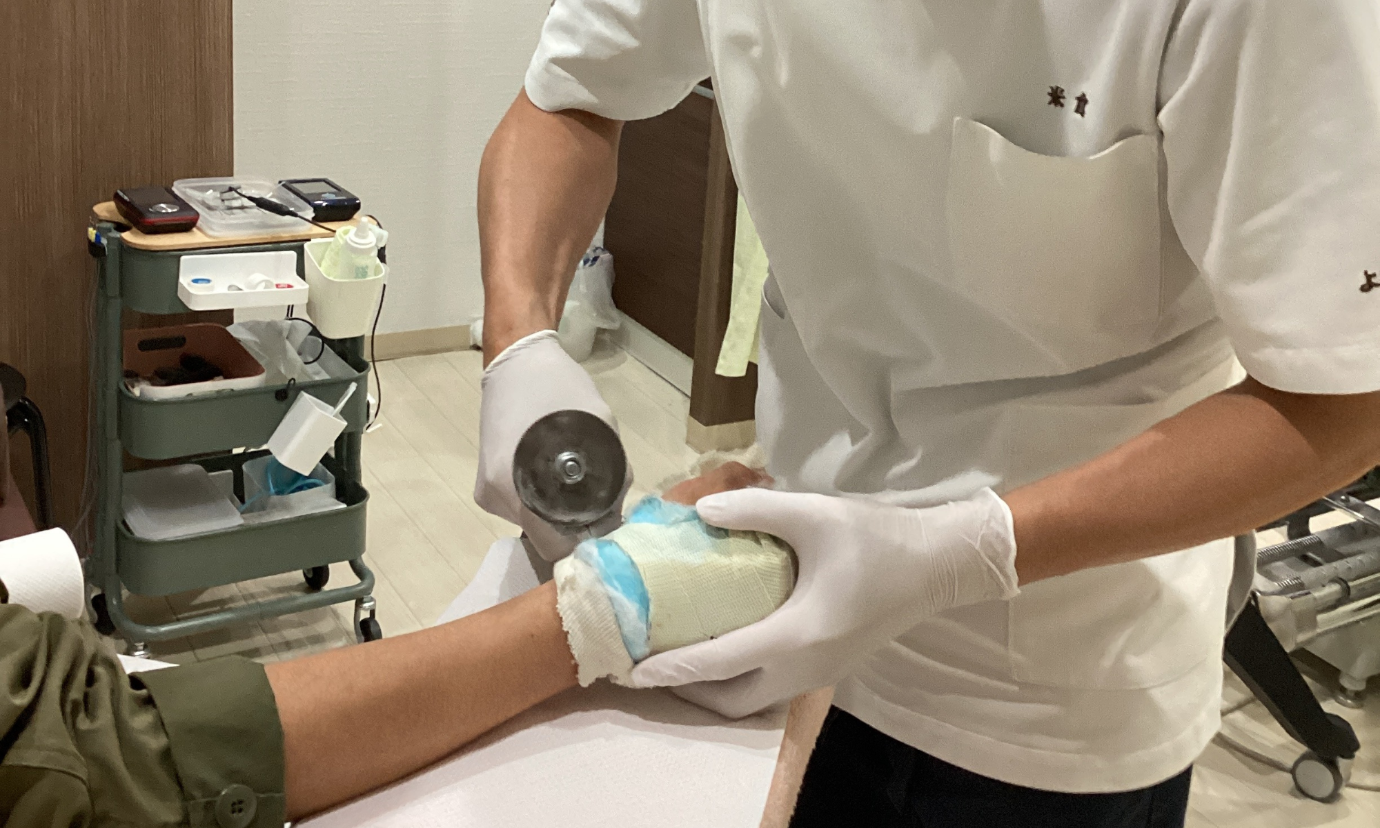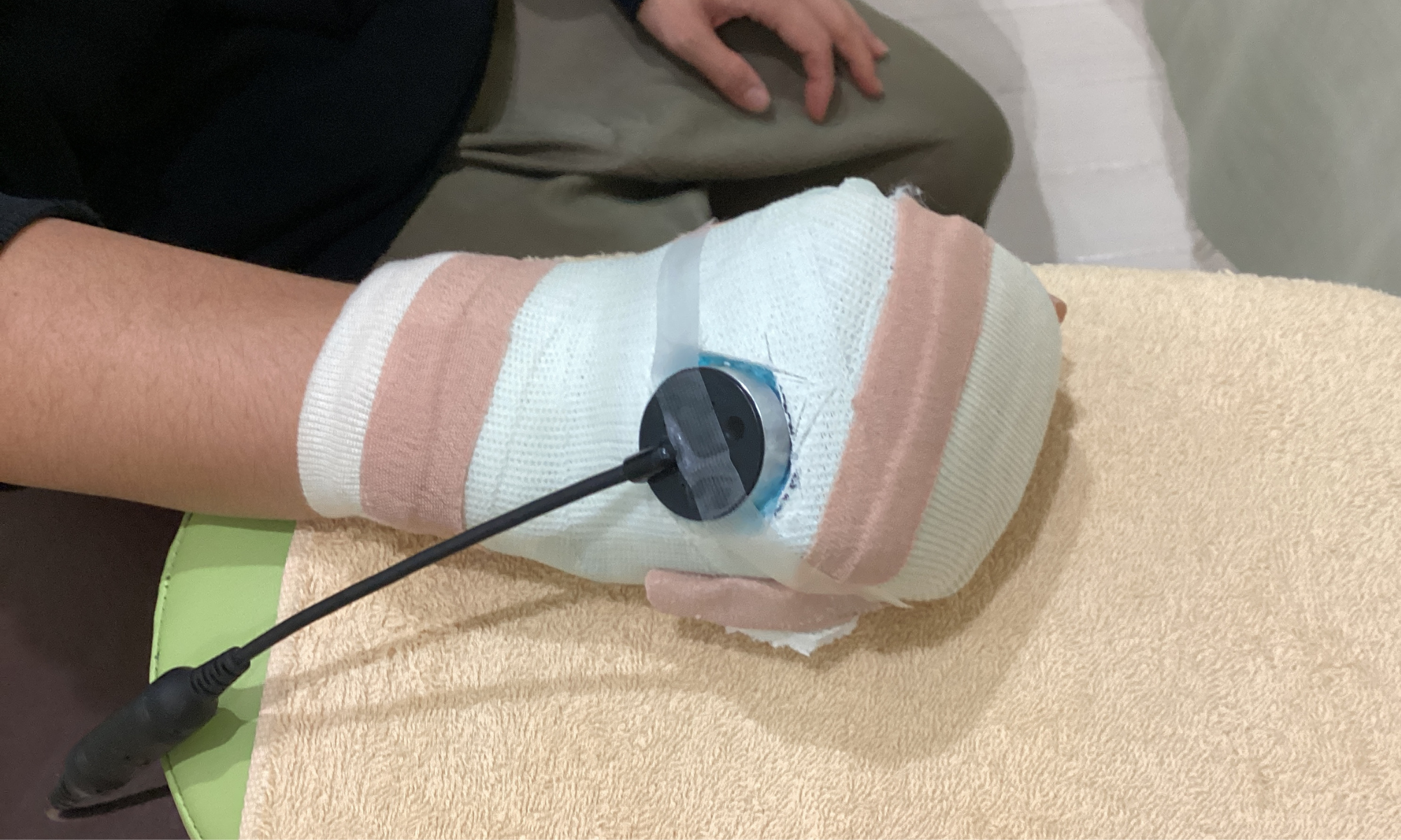 固定管理の一部として、医師の同意・指示のもとでLIPUS(低出力パルス超音波)を行うため、 キャストに開窓処置を行いました。固定力を保ちつつ、骨折部位へ安定してプローブを当てやすくなり、骨癒合を促進致します。
