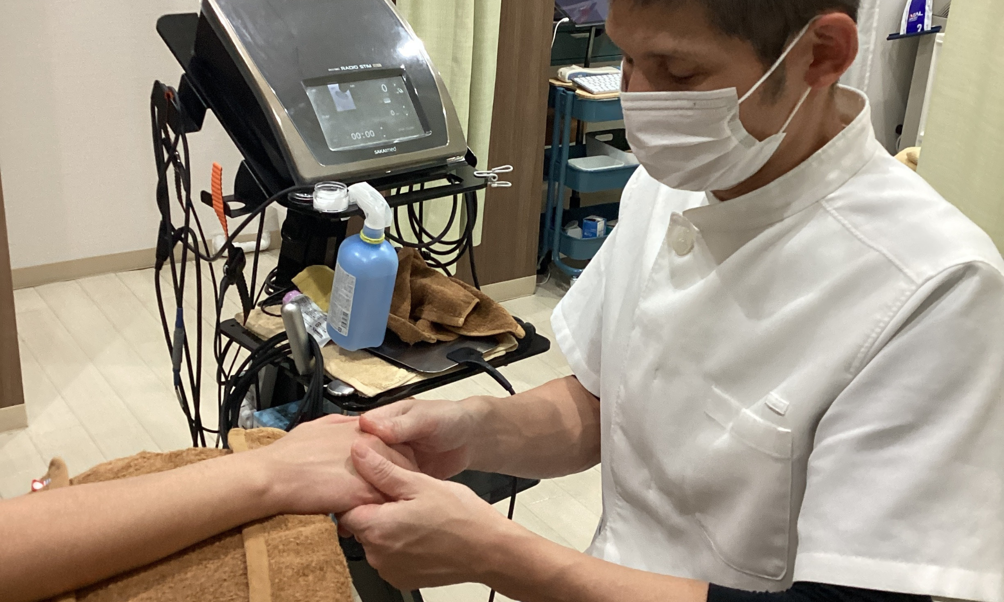 キャスト除去後は状態を確認しながら、ラジオ波を併用してROM訓練を開始しました。 ナックルキャスト固定は屈曲拘縮を予防しやすい反面、固定の影響で伸展方向のROM低下が目立つことがあります。 ただし、伸展方向の可動域は比較的改善しやすいことも多く、反応を見ながら段階的に進めました(※個人差があります)。