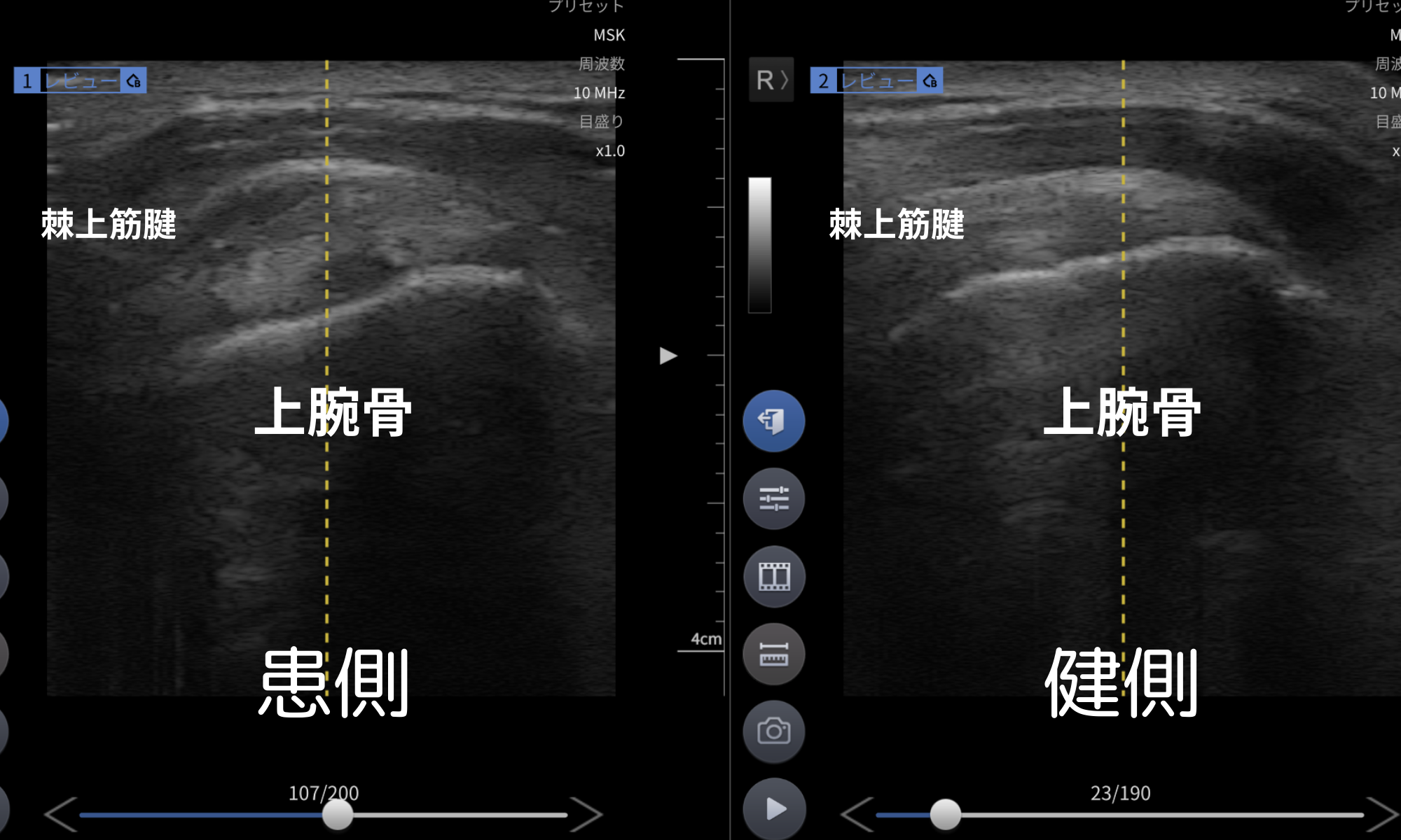 棘上筋腱の膨隆を確認。腱実質の断裂は認めず。 軽度の炎症と判断し、いわゆる軽傷の部類と評価しました。