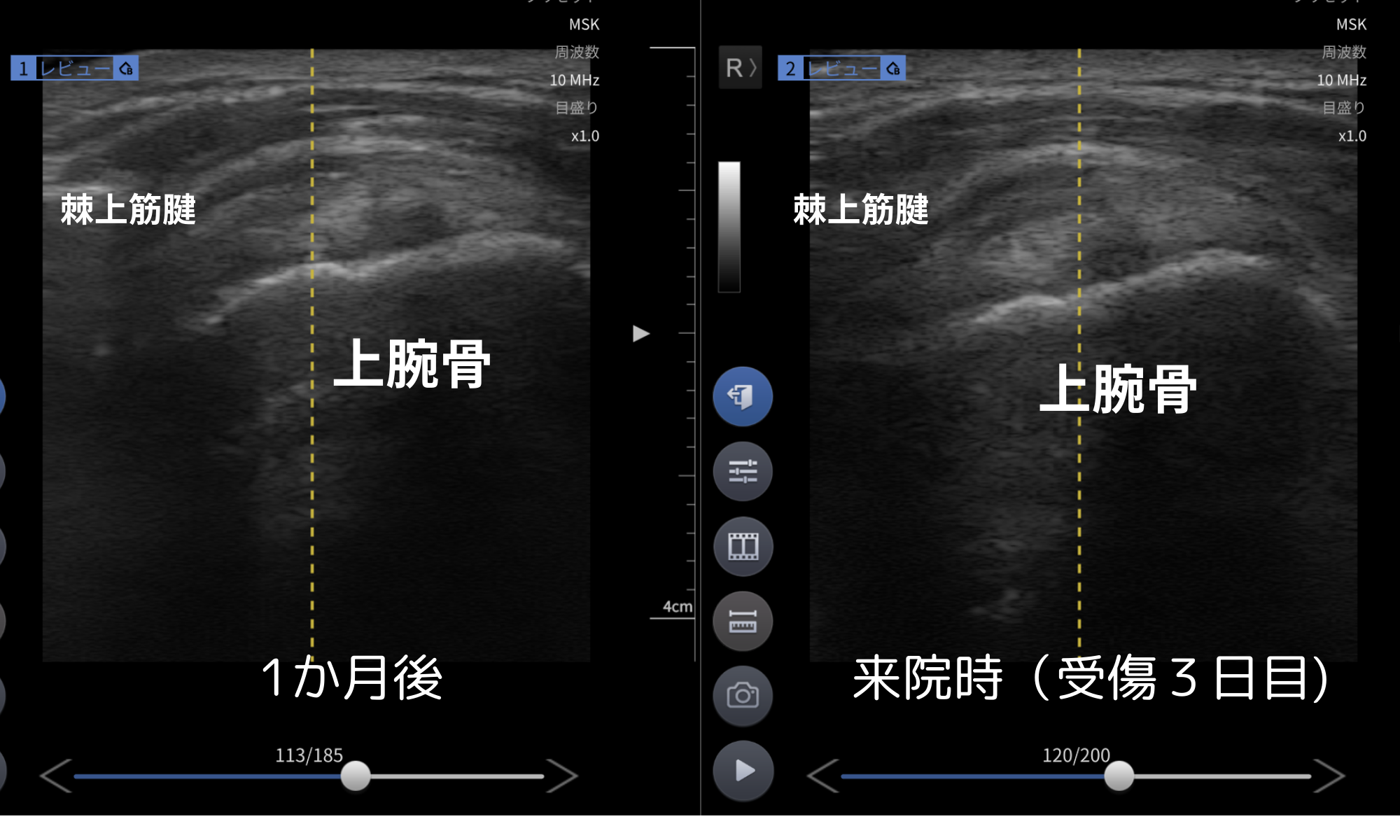 約1か月後のエコー評価では、わずかに棘上筋腱の膨隆は残存していましたが、 疼痛・ROM制限ともに消失し、日常生活に支障がないことから治癒と判断しました。