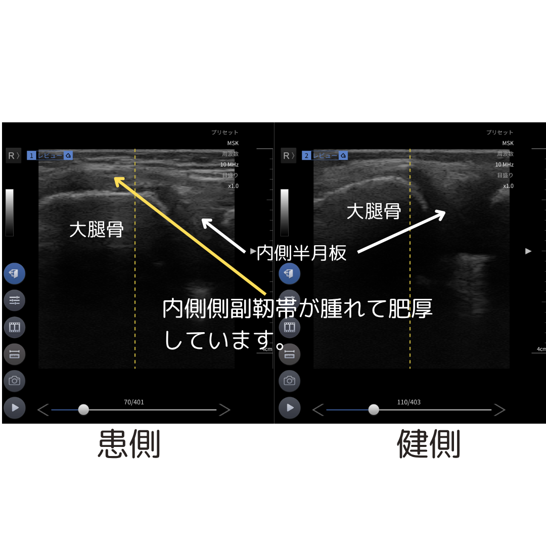 - 超音波エコー検査:MCL部の靱帯繊維に不整と肥厚を確認、関節包内に微量の関節水腫あり